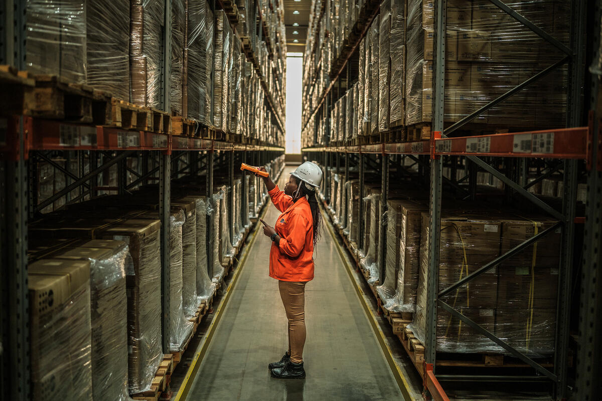 Image: Resty Nakate, a warehouse officer at the National Medical Stores scans medical kits in Entebbe, Uganda. The Global Fund/Brian Otieno.
